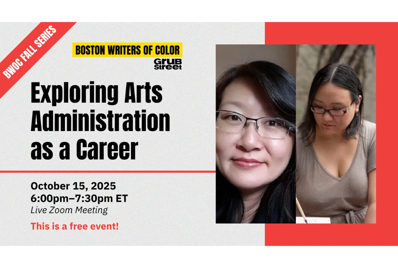 Join us for a moderated discussion of what it's like to be a writer with a day job in arts administration. GrubStreet's Director of Faculty & Fellowships, Eson Kim, will provide an everyday look into this field of work, and also cover key skills to cultivate and highlight in preparation for applying and interviewing for arts administration jobs. In conversation with BWOC member and Grub instructor Maria Picone, Eson will also candidly share some key considerations in choosing whether or not to pursue full-time arts administration careers while also balancing your creative aspirations. An audience Q&A will take place during the last 30 minutes of the session.