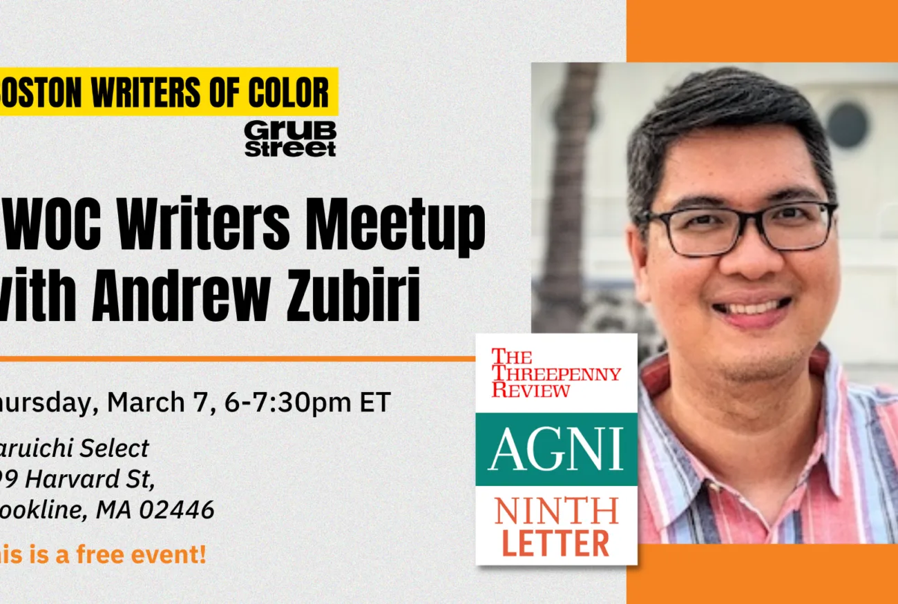 Join the Boston Writers of Color for our writers meetup! We welcome novelists, screenwriters, poets, essayists, bloggers, and even those who are new to writing. Meet new friends, relax and unwind with a drink, snacks and some writerly conversation! The event will be hosted by BWOC member and writer Andrew Zubiri.